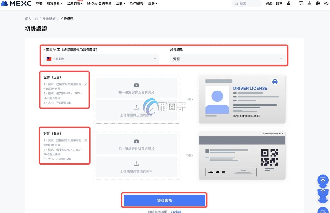 6、在初级认证页面,选择您的【国家/地区(请选择证件的签发国家)】和【证件类型】。成功后,请点击【提交审核】,初级认证将于24小时内给出结果。