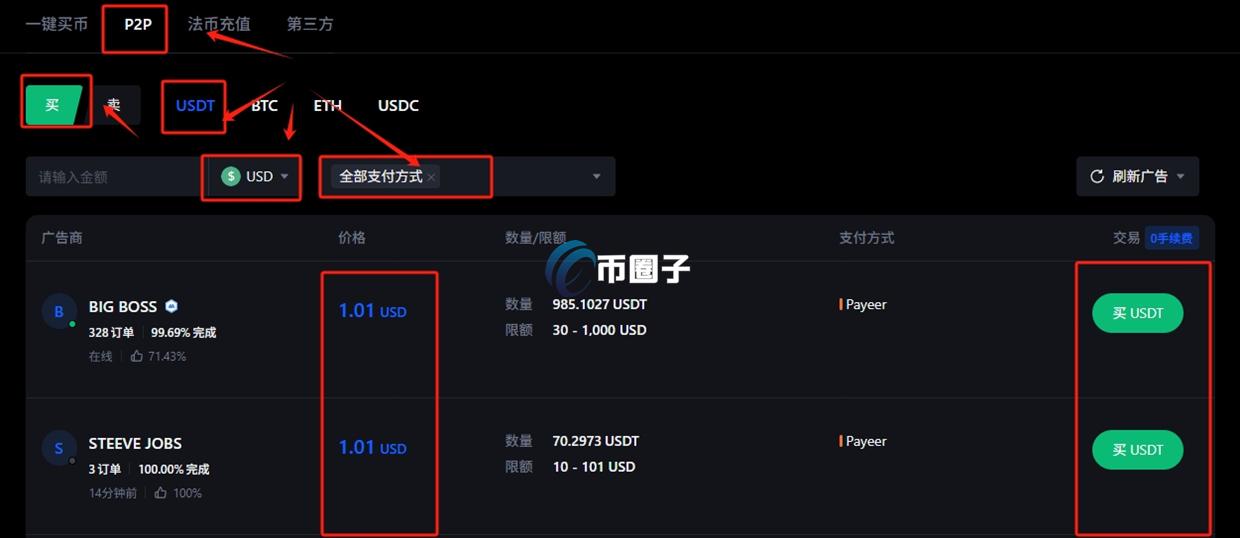 7、认证结束后,点击首页页面上方导航栏的“买币”——“法币交易”,购买货币之前通常需要购买一定数量的USDT,以便交易。选择C2C,选择买币,选择USD,根据自己的需求选择合适的商家。
