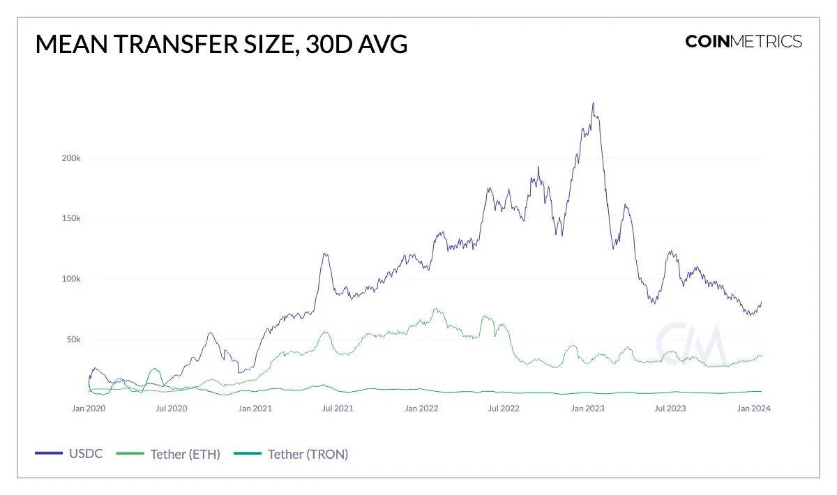 为了更好地理解使用模式和Tether为哪些人提供服务,研究“典型” Tether 交易的性质是有见地的。数据显示,USDT的平均转账金额通常小于USDC的平均转账金额,后者目前平均每笔交易约为75000美元。这更高的平均值表明,USDC通常用于较大规模的交易,这与其作为主要境内(指美国)稳定币的地位及其在 DeFi 应用中的广泛使用相一致。