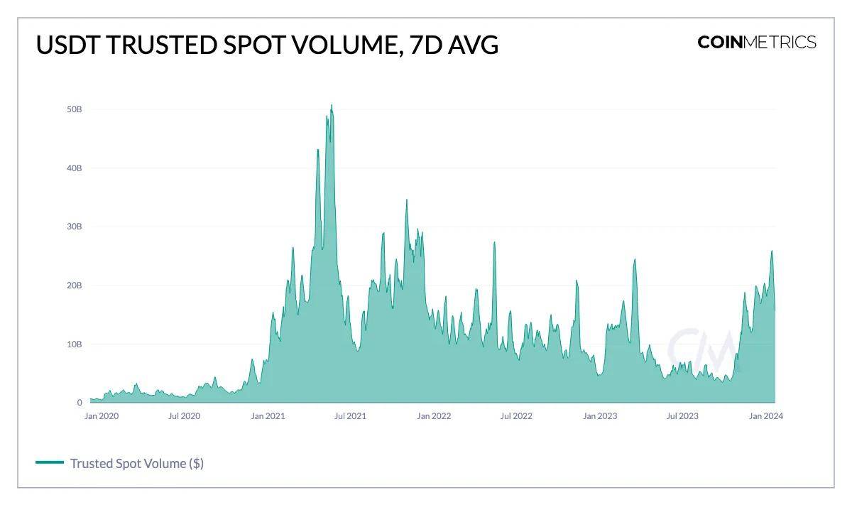 USDT 与其他稳定币一样,作为报价资产也发挥着至关重要的作用,促进了数字资产在交易所上的流动易。随着近期数字资产市场的繁荣和比特币现货 ETF 的推出,USDT 已促成了超过 250 亿美元的可信现货交易量,超过了 2022 年 11 月和 2023 年 3 月的峰值。Tether 在这一领域也发挥着主导作用,占稳定币计价交易量的 85% 以上。