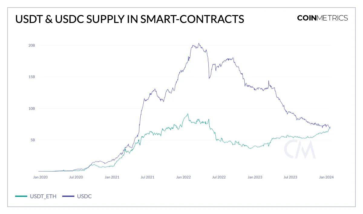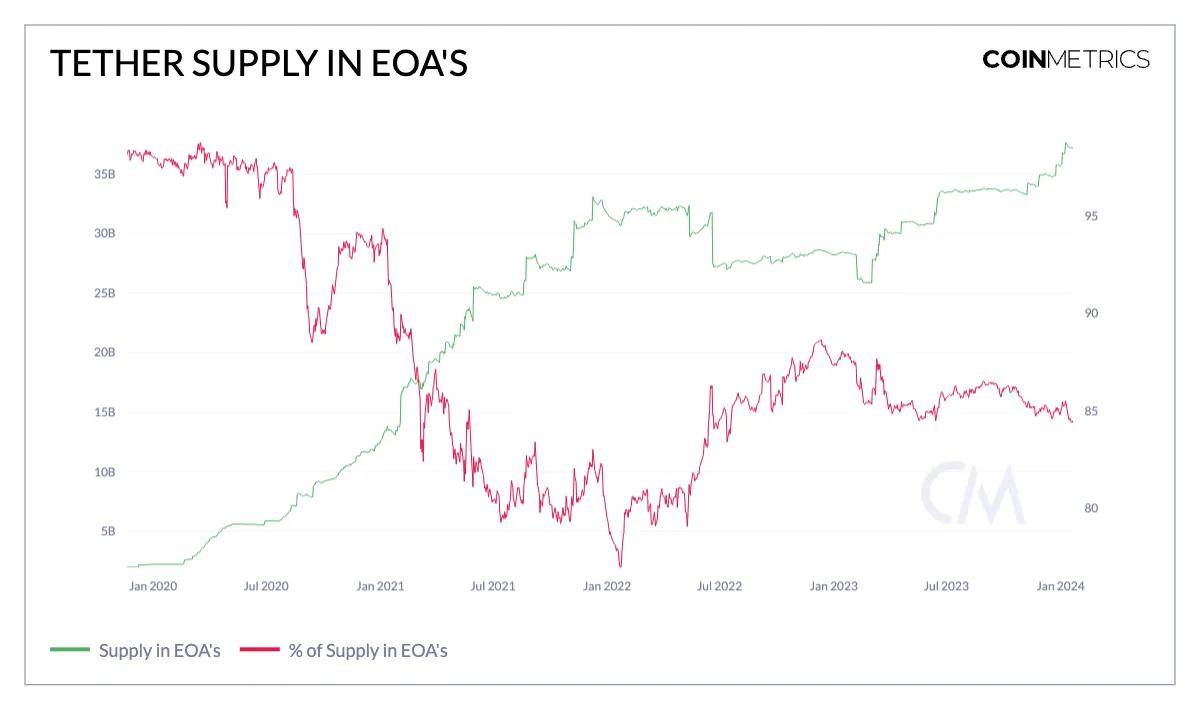 尽管Tether在智能合约中的使用已经扩大,但它主要由外部拥有的账户(EOA)或由私钥控制的账户持有,类似于个人用户拥有的账户。在以太坊上,Tether(ETH)的供应已经上升到370亿美元,占以太坊总供应的84%。这些趋势反映了数字美元的不断增长,不仅作为价值存储或对冲波动的工具,还作为交易活动的工具,例如交易或支付。