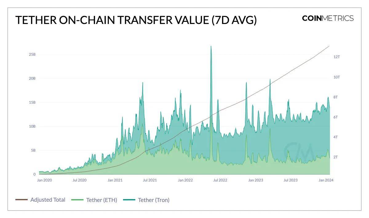 作为最大和最广泛采用的稳定币,Tether 得到了广泛的使用。本月,在以太坊网络上涉及不同USDT地址的调整后链上转账价值超过了50亿美元。与此同时,波场网络上的转账价值超过了110亿美元。自2014年推出以来,Tether已经促进了超过13万亿美元的转账,强调了它的不断增长的使用。这种广泛的采用在非洲、拉丁美洲、南亚和其他地区的新兴市场尤为显著。在这些地区,Tether通常充当美元的替代品。它提供了保护储蓄的手段,寻求经济稳定,并提供了银行基础设施的访问,从而为各种目的的点对点交易提供了可能。